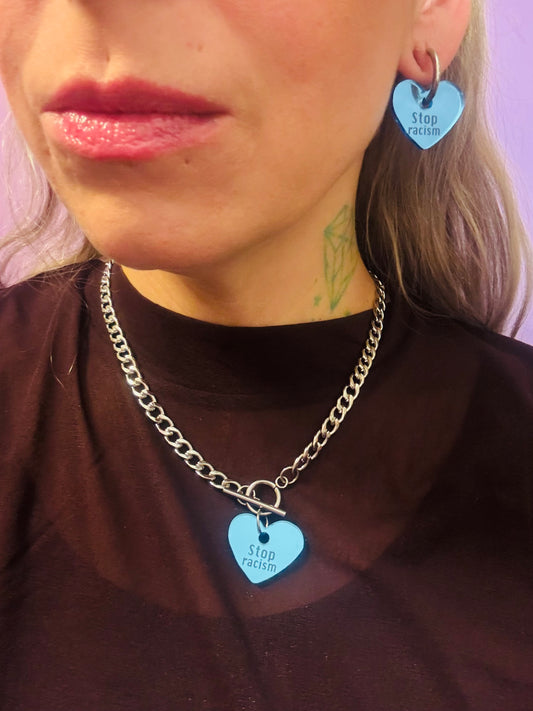 Stop racism necklace steel chunky chain/sky blue mirror