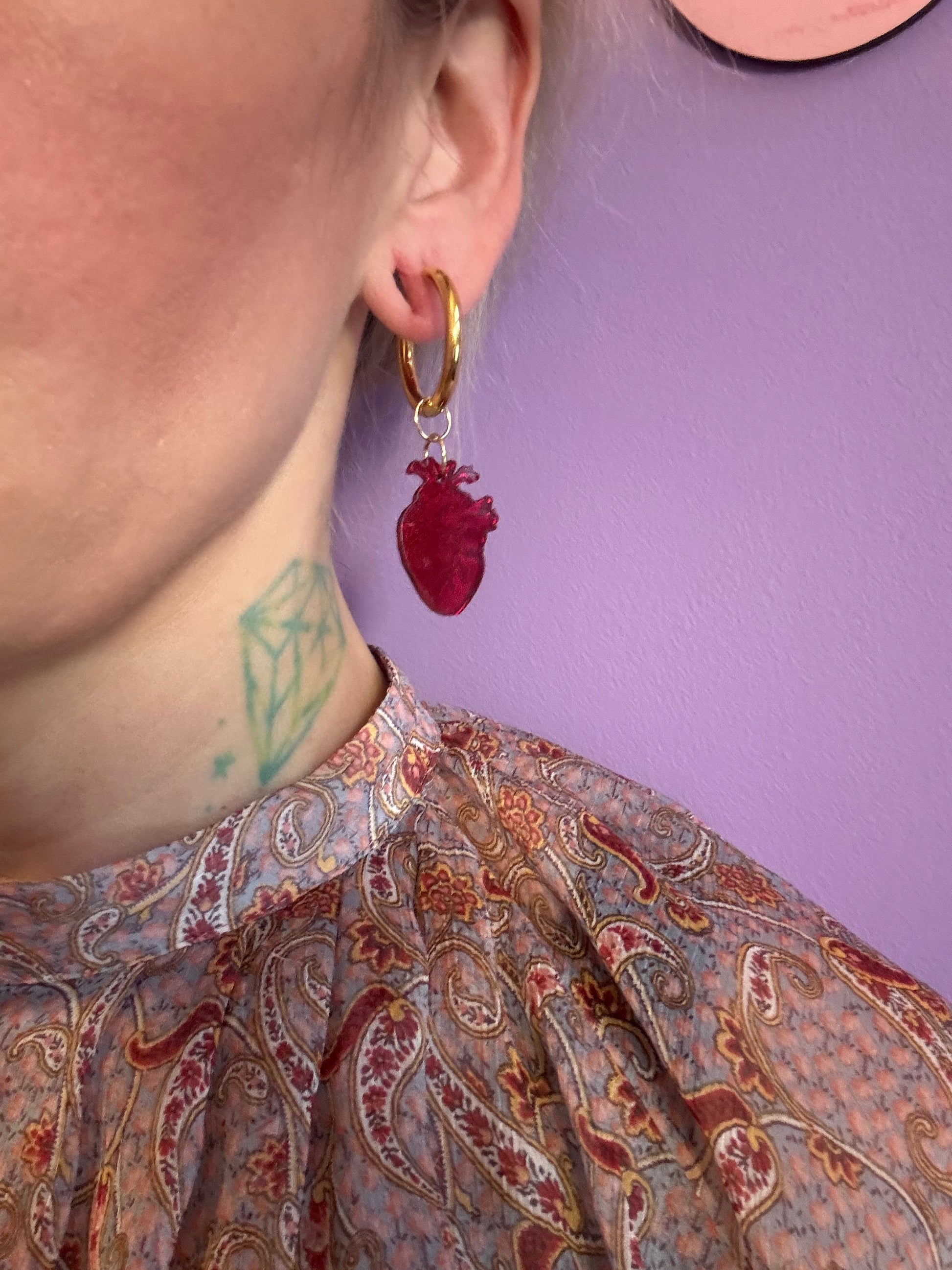 These striking anatomical heart earrings are both beautiful and unique - just like you! Handcrafted in Helsinki and Vallila from European mirror acrylic, they feature nickel-free gold or steel-toned stainless steel rings. Choose from gold or steel-colored hoops in the menu.