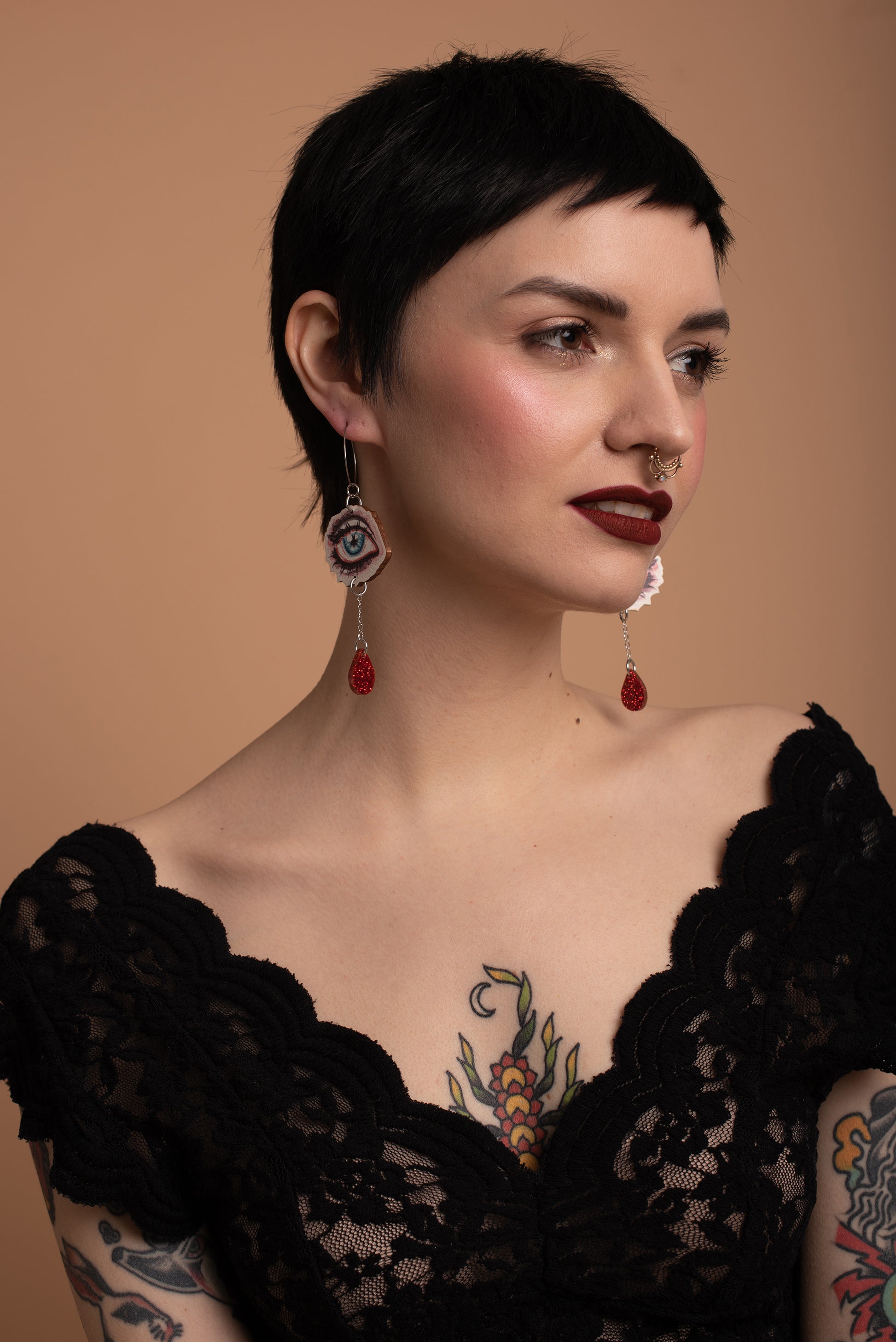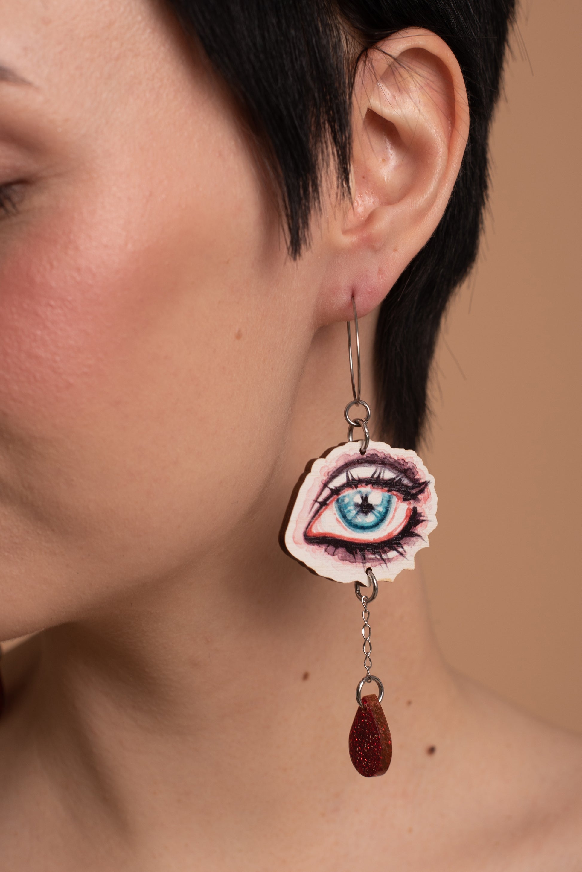Our earrings are two sided. We use nickel-free metals in our jewels.The jewel is produced with a high-quality Finnish birch plywood. Our plywood is PEFC & FSC certified sustainable and made in Finland. The drop is glitter acrylic made in England and cut in Vallila. The hooks are made of jewelry steel. The print of the earrings is double-sided. The earrings are very light, only a few grams per earring.