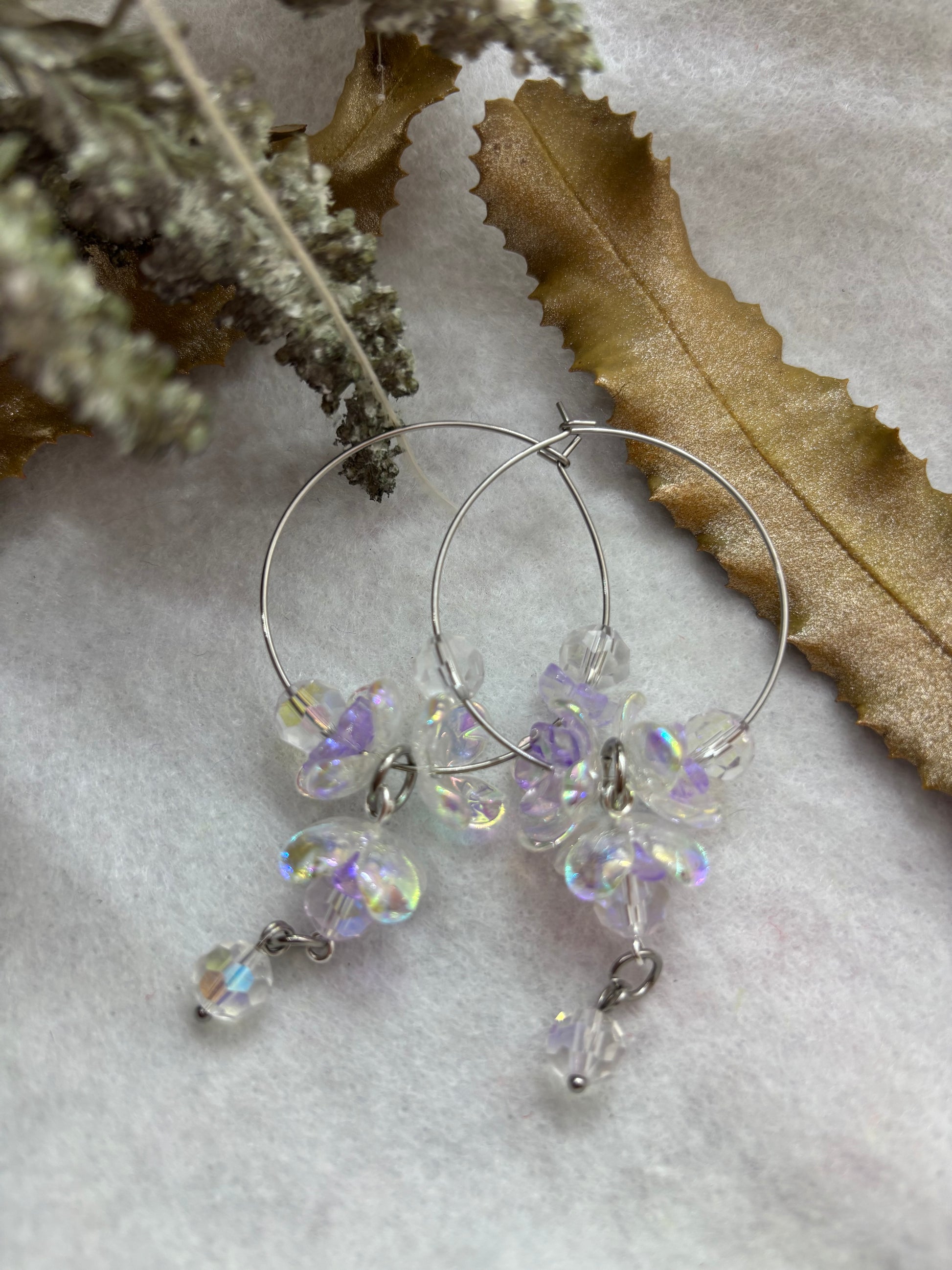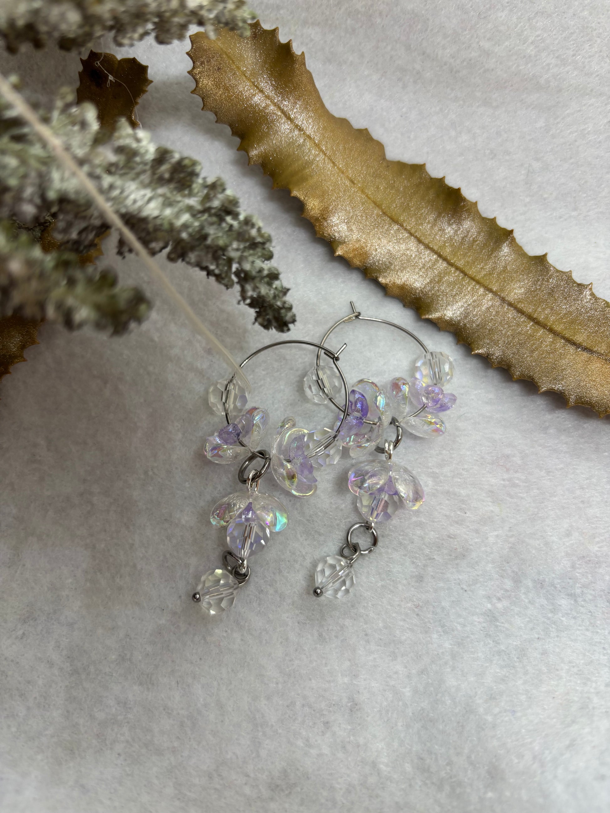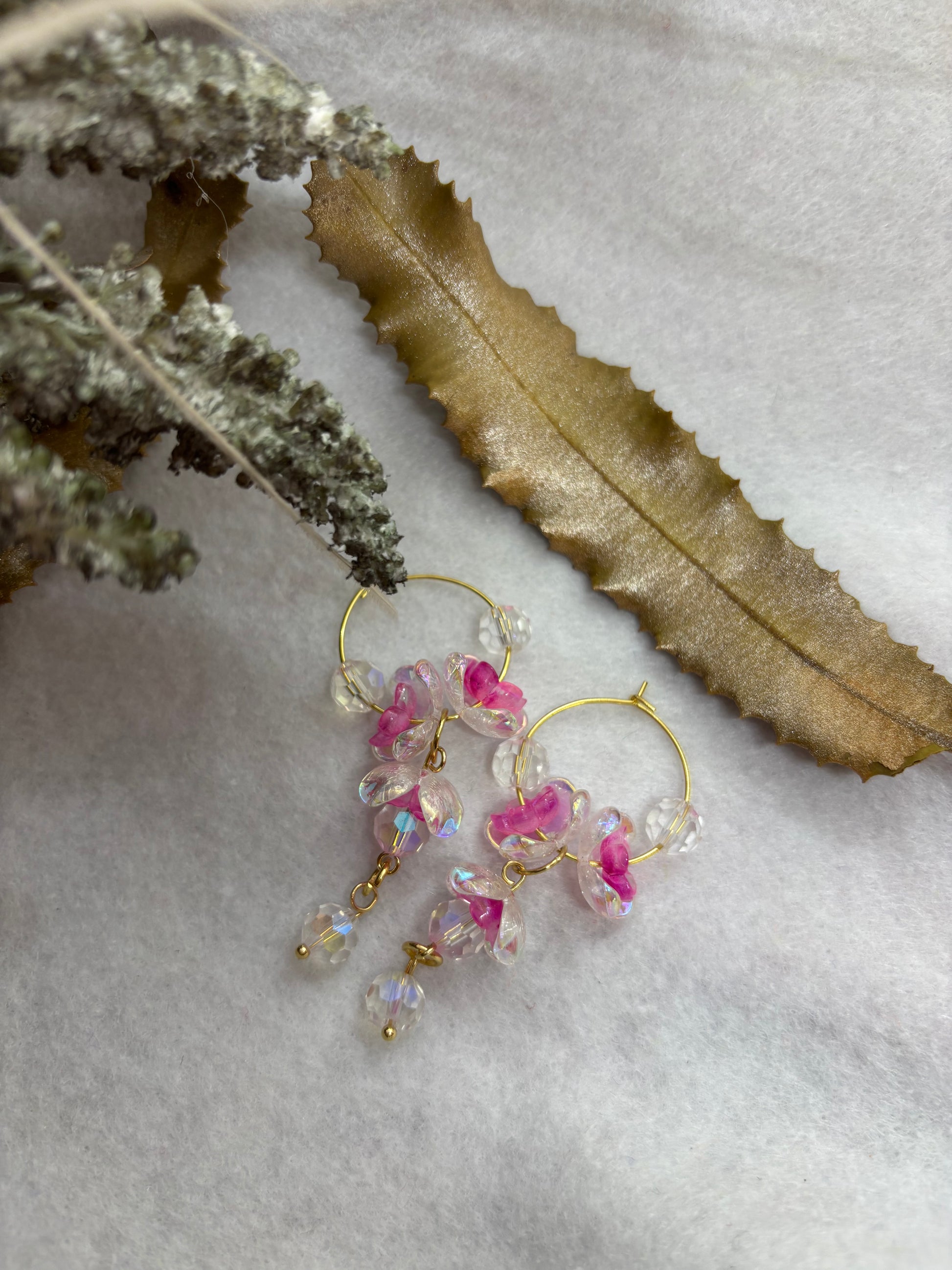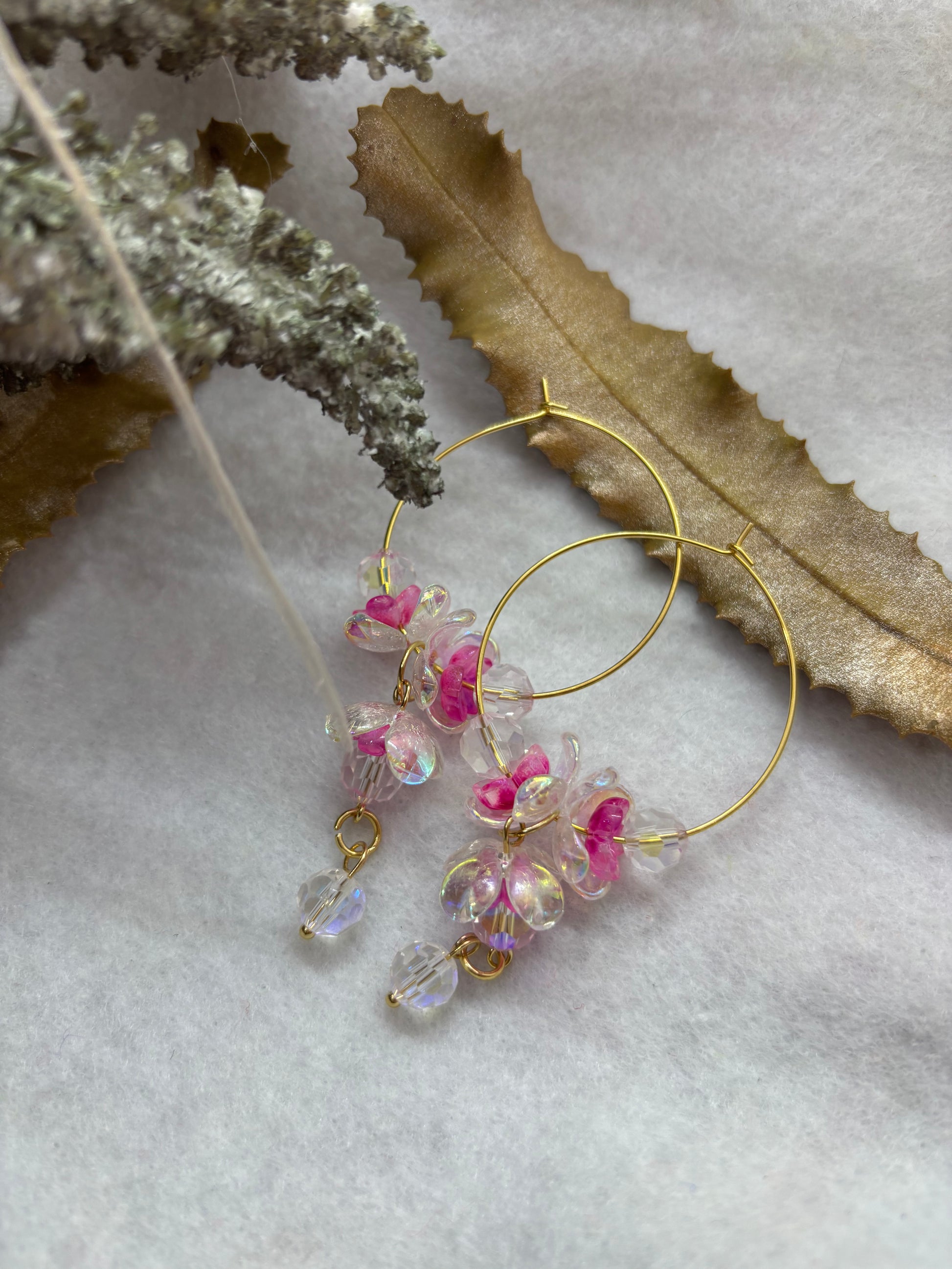 Channel divine elegance with Freija's Treasure hoops, inspired by the goddess of beauty and magic. These lightweight earrings blend acrylic and glass with golden-toned stainless steel details for a luminous finish. Designed for comfort and timeless style, they're available in two sizes: large (7cm) and small (6cm). A celestial addition to your jewelry collection.