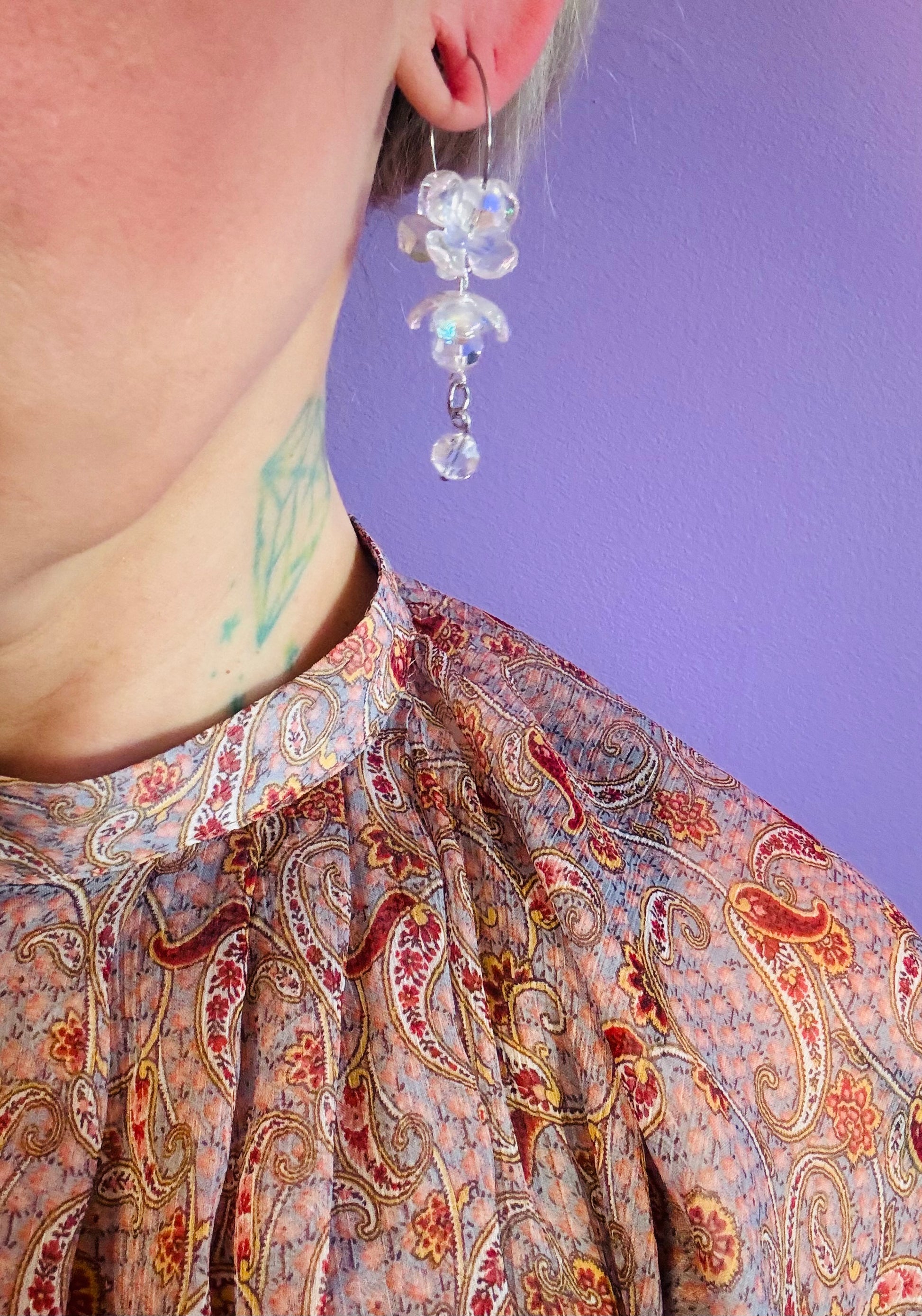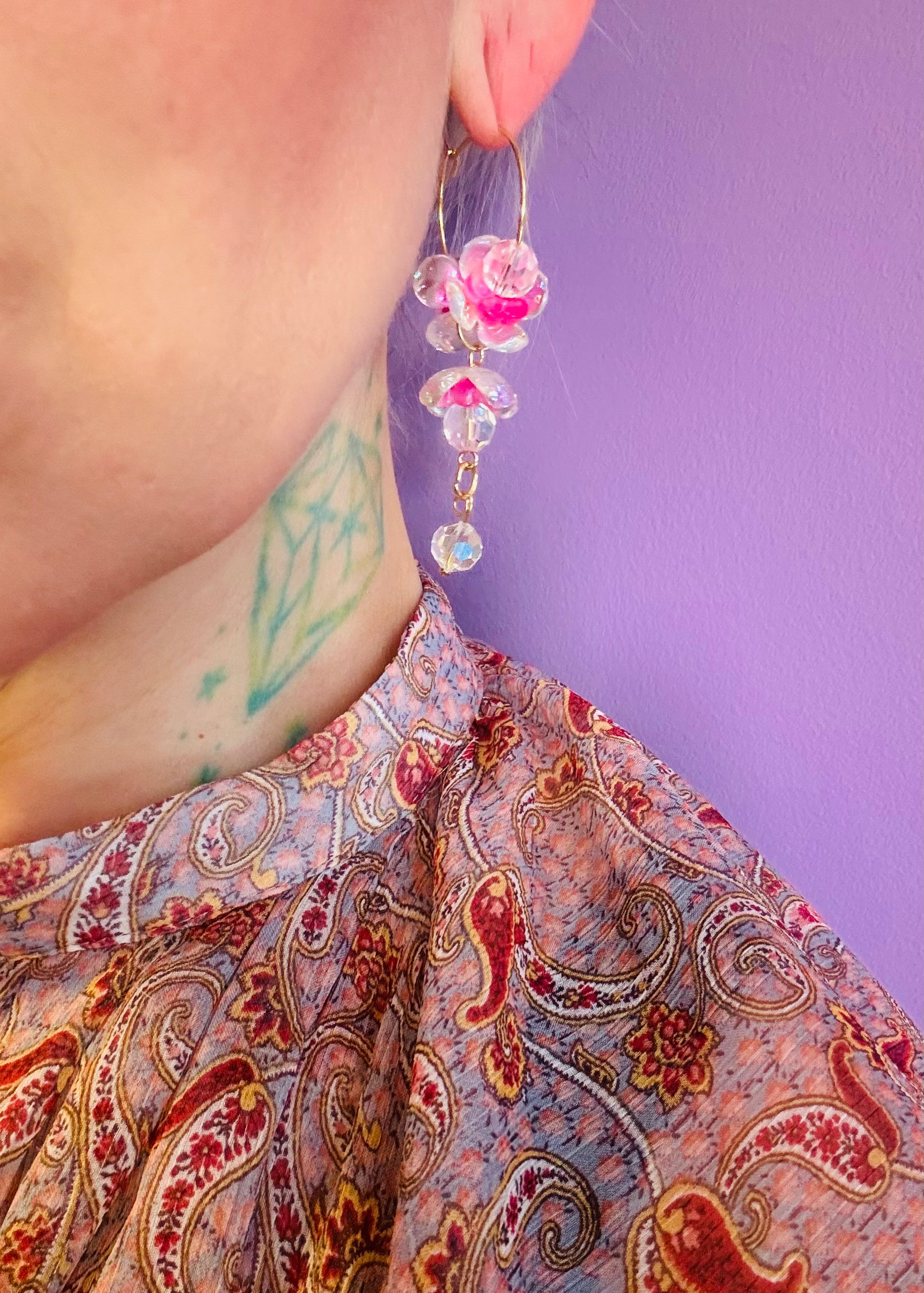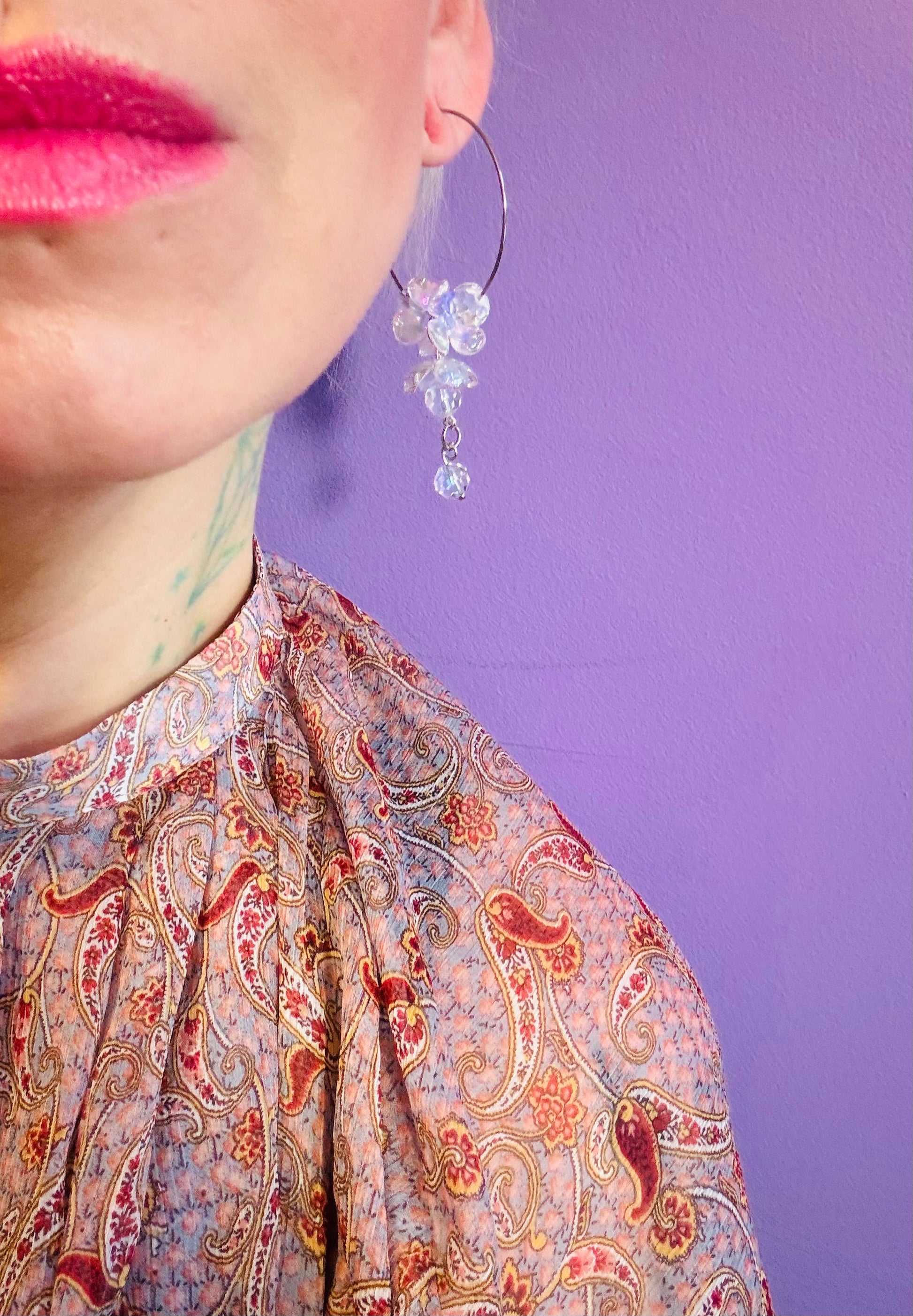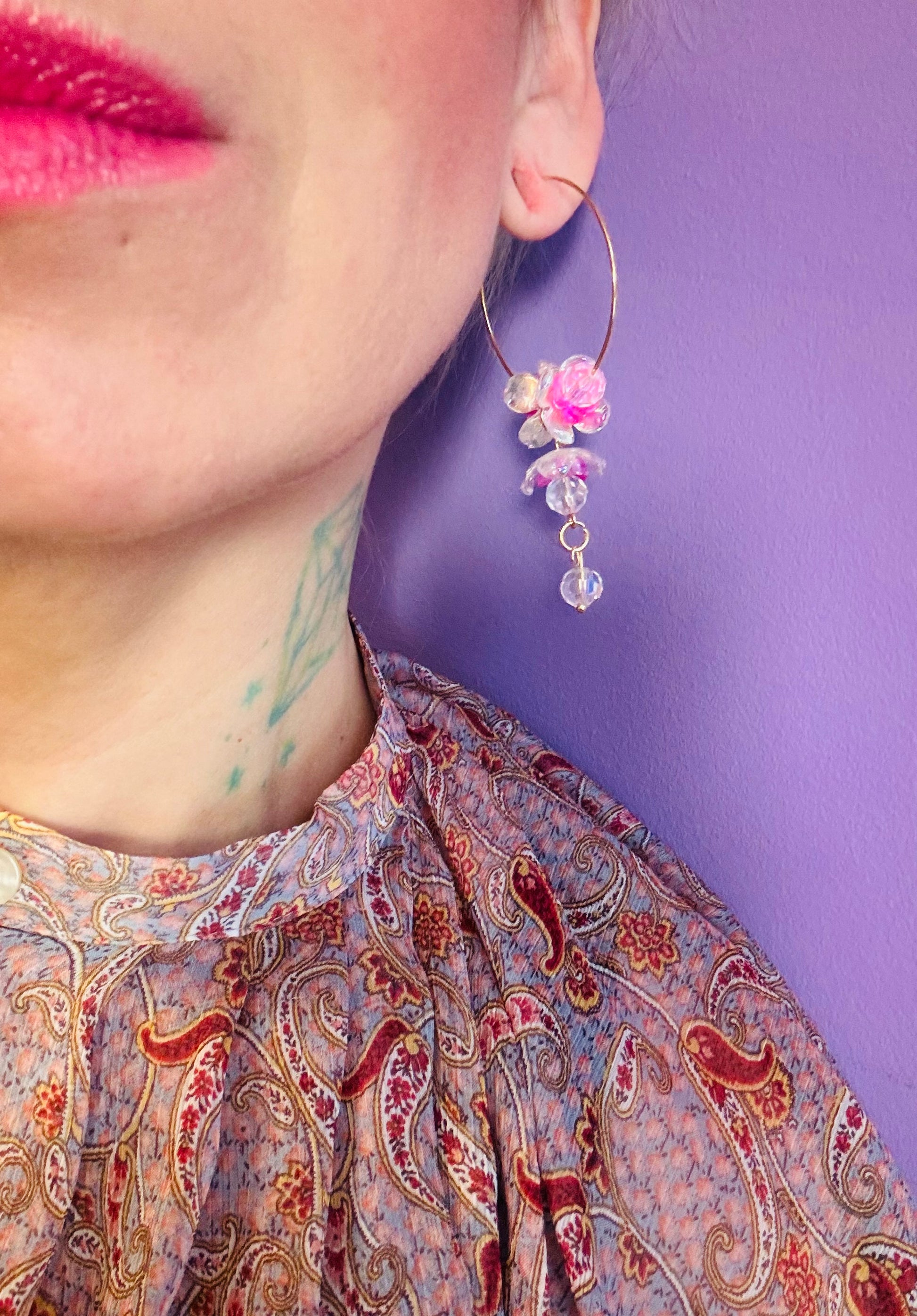 Channel divine elegance with Freija's Treasure hoops, inspired by the goddess of beauty and magic. These lightweight earrings blend acrylic and glass with golden-toned stainless steel details for a luminous finish. Designed for comfort and timeless style, they're available in two sizes: large (7cm) and small (6cm). A celestial addition to your jewelry collection.