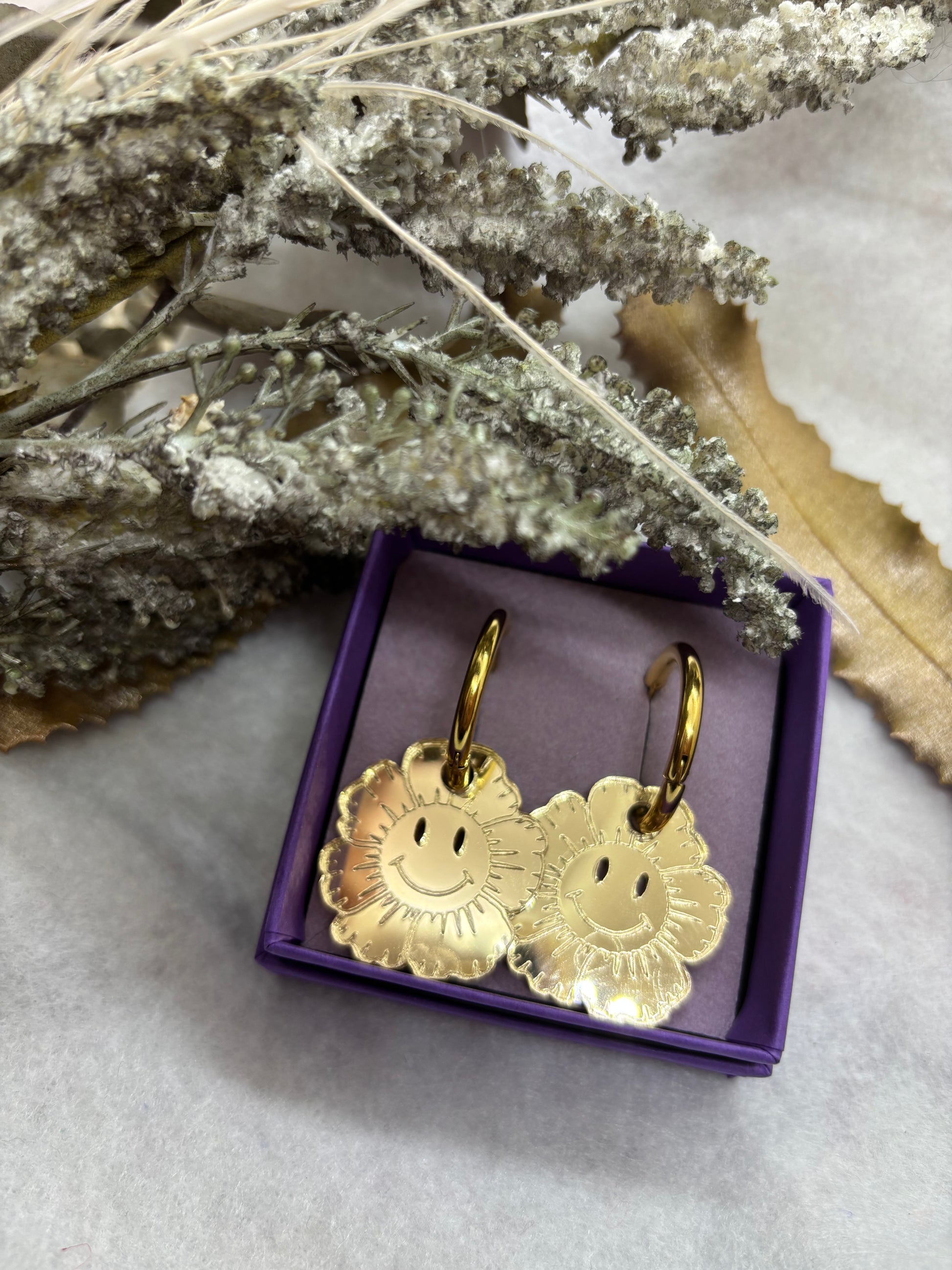 Happy flower earrings made from golden mirror. Be stylish it rained or shined!