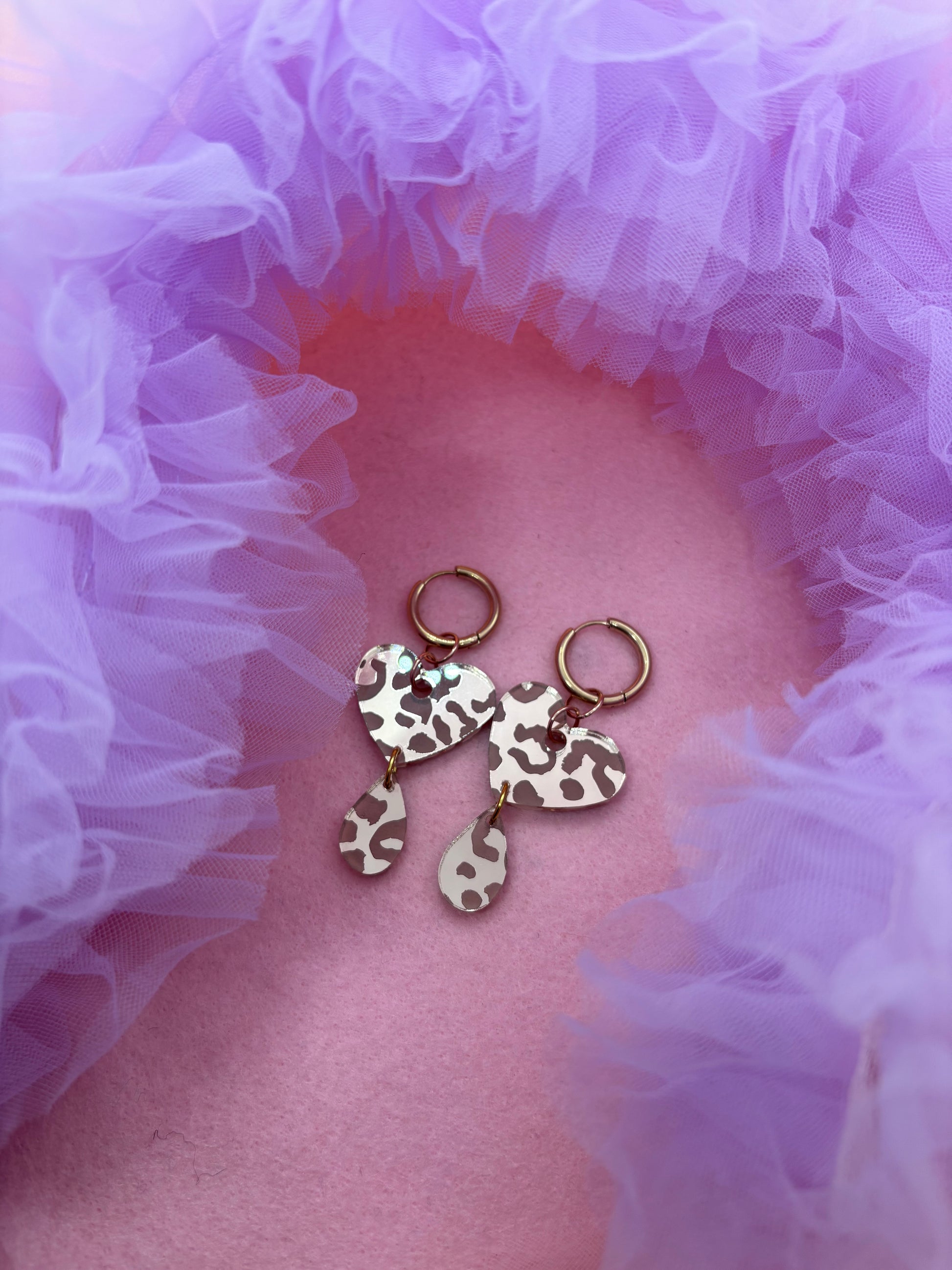 EN: Bold leopard-print mirror earrings that command attention with every wear. Crafted from acrylic mirror and surgical steel, these statement pieces transition effortlessly from cozy knits to lightweight layers and pair beautifully with denim. Handcrafted in Helsinki's Vallila district, they're the perfect accent for anyone seeking distinctive, wearable art.