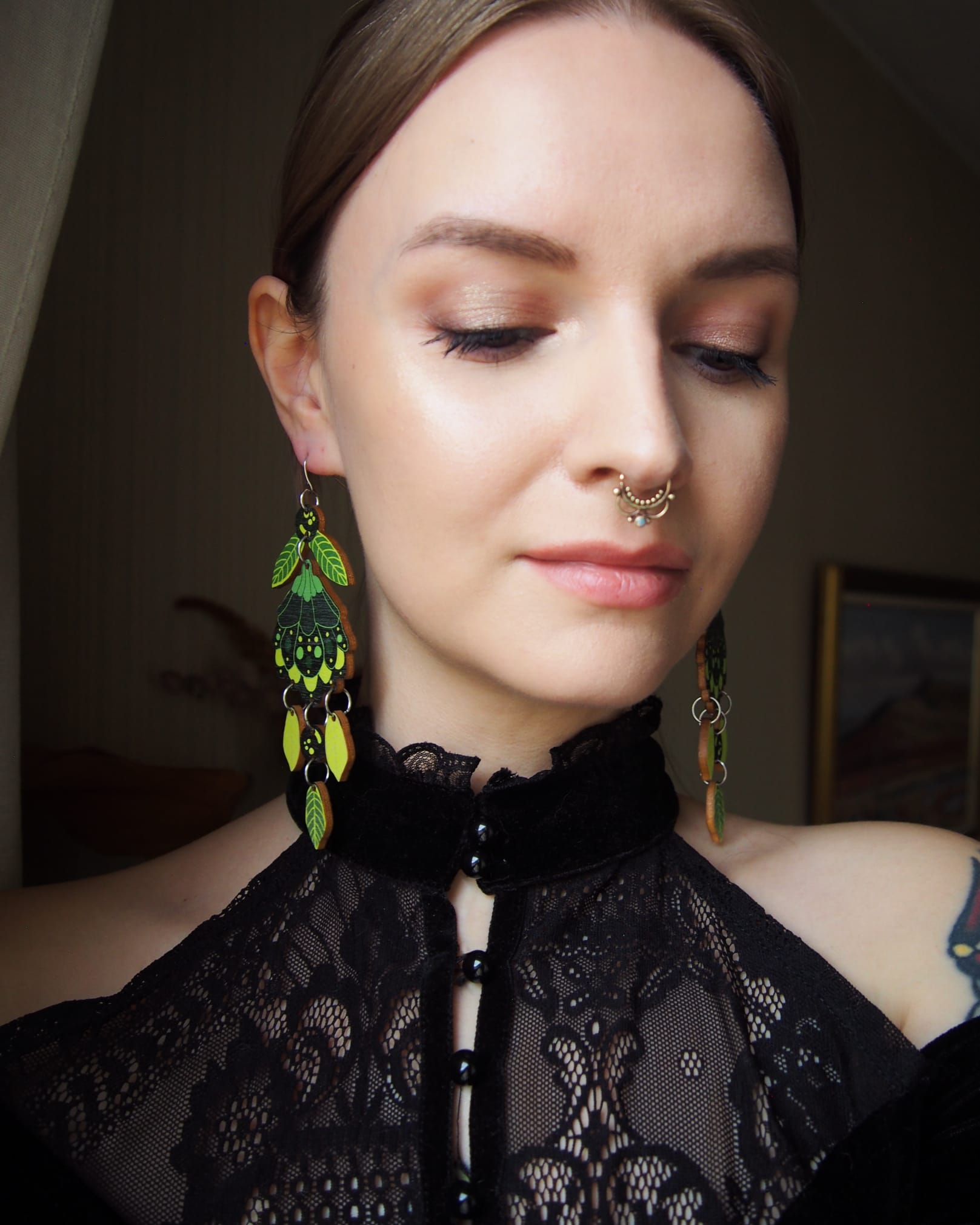 The multi-layered Harvest earrings perfectly balance boldness and lightness. These large, colorful pieces feature a bohemian style that offers versatile wear and inspires diverse outfit choices. Crafted from durable materials such as jewelry steel and Finnish birch plywood, they add a high-quality finish to any look.